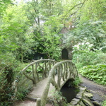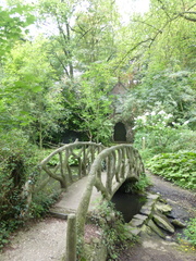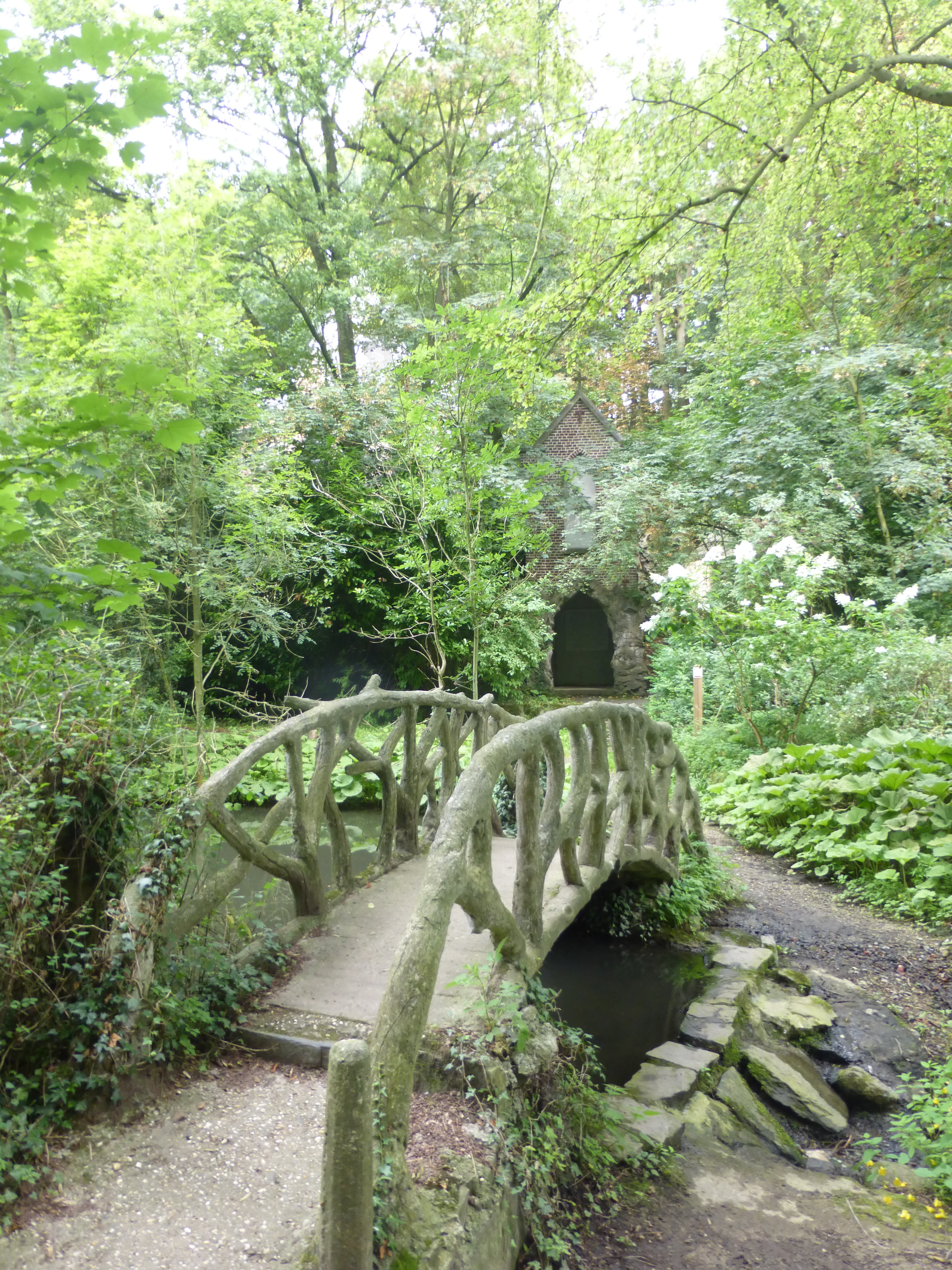 Cementrustieke brug en zicht op rotskapel
