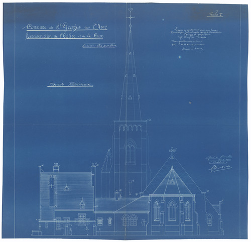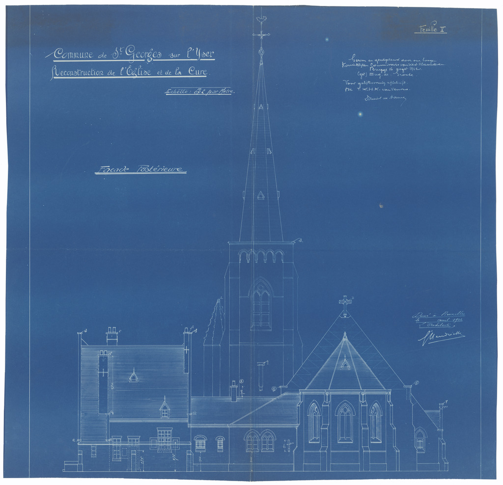 Opschrift: Commune de St. Georges sur l'Yser. Reconstruction de l'Eglise et de la Cure Omschrijving plan: opstand achtergevel Datum KCML: 16/08/1922 Archiefnummer: W1295