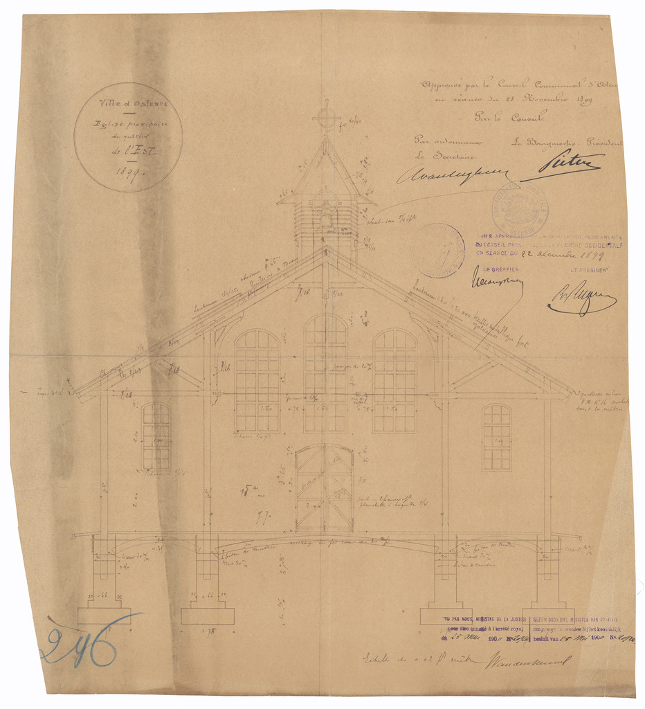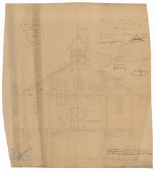 Opschrift: Ville d'Ostende. Eglise provisoire du quartier de l'Est Omschrijving plan: dwarsdoorsnede Datum KCML: deze informatie wordt niet vermeld op het archiefstuk Archiefnummer: W1331