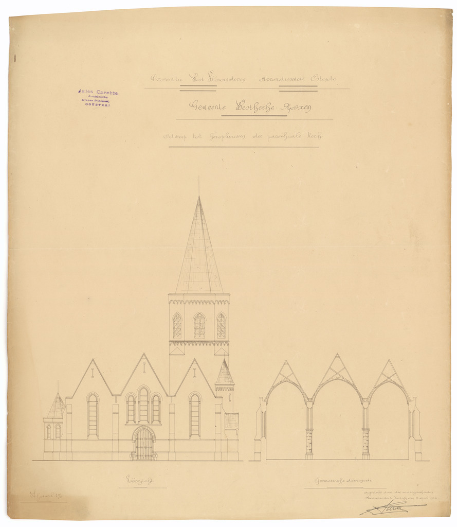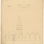 Opschrift: Provincie West-Vlaanderen. Arrondissement Ostende. Gemeente Westkerke - Roxem. Ontwerp tot heropbouwen der parochiale kerk. Omschrijving plan: opstand voorgevel en dwarsdoorsnede Datum KCML: deze informatie wordt niet vermeld op het archiefstuk Archiefnummer: W1392