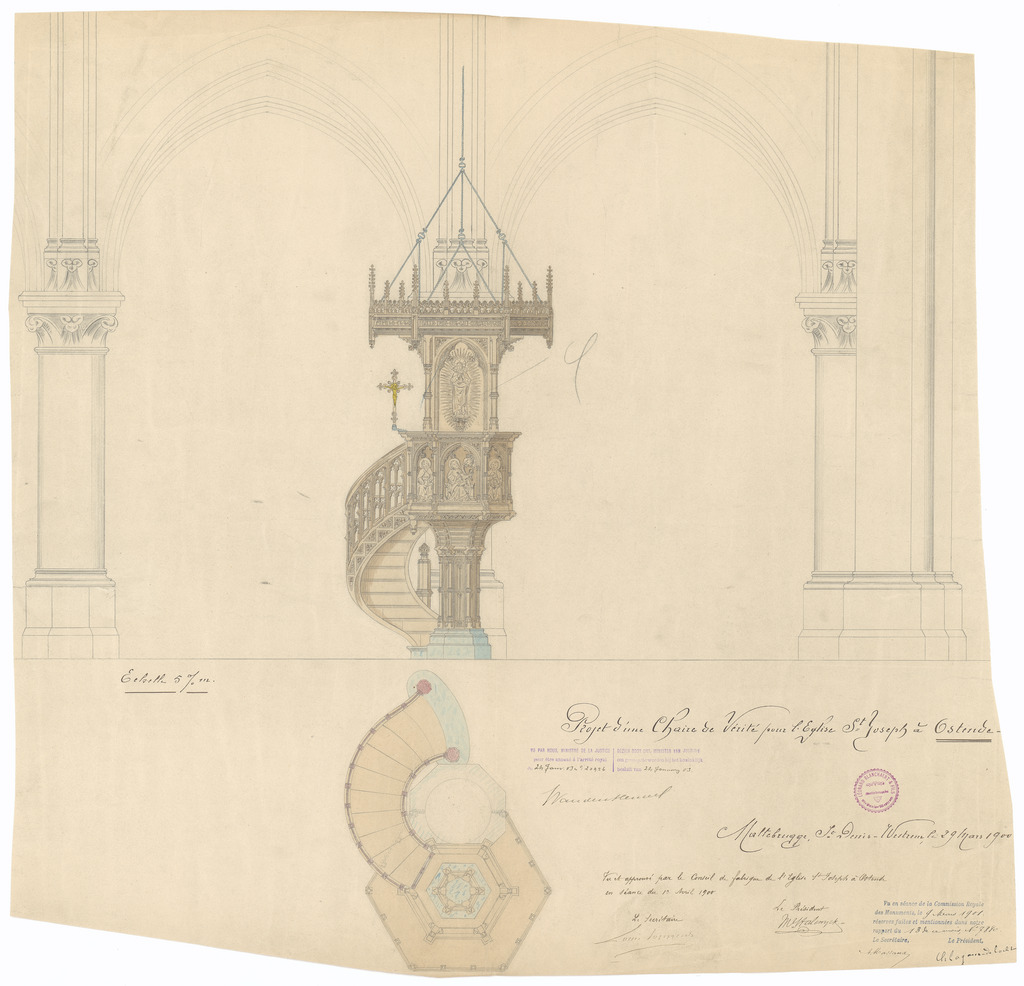Opschrift: Projet d'une Chaire de Vérité pour l'Eglise St. Joseph à Ostende Omschrijving plan: ontwerp preekstoel Datum KCML: 9-3-1901 Archiefnummer: W1313