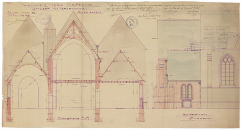 Opschrift: Parochiale kerk Oostcamp. Ontwerp tot vergrooting. Omschrijving plan: dwarsdoorsnede en opstand zijgevel Datum KCML: 8-6-1929 Archiefnummer: W1360