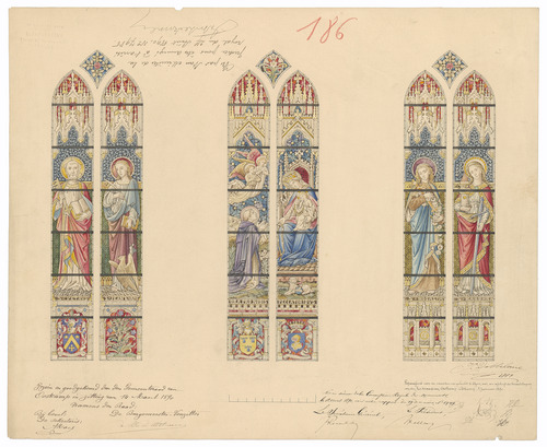 Opschrift: deze informatie wordt niet vermeld op het archiefstuk Omschrijving plan: ontwerp glasramen Datum KCML: 12/04/1890 Archiefnummer: W1366
