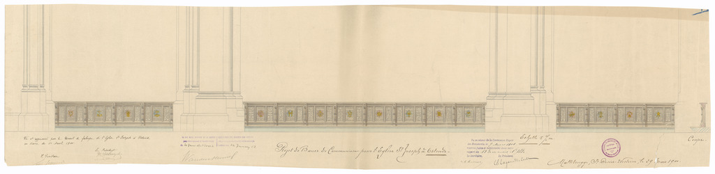 Opschrift: Projet de Bancs de Communion pour l'Eglise St. Joseph à Ostende. Omschrijving plan: ontwerp communiebank Datum KCML: 9-3-1901 Archiefnummer: W1316