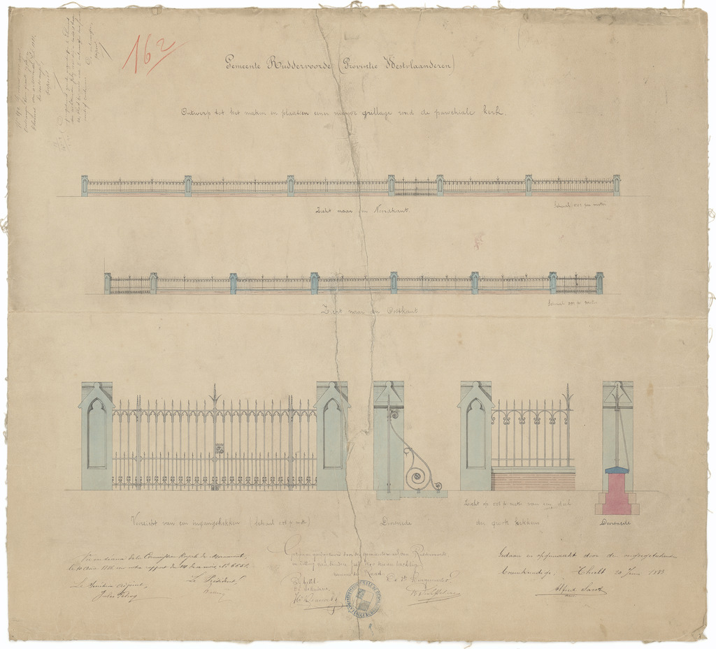 Opschrift: Gemeente Ruddervoorde (Provincie Westvlaanderen). Ontwerp tot het maken en plaatsen eener nieuwe grillage rond de parochiale kerk. Omschrijving plan: ontwerp afsluiting Datum KCML: 10/08/1886 Archiefnummer: W1373
