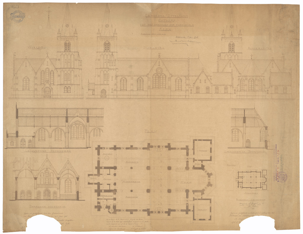 Opschrift: Gemeente Ettelghem. Ontwerp tot het opbouwen der parochiale kerk. Omschrijving plan: plattegrond, gevelopstanden en doorsneden Datum KCML: 13/03/1909 Archiefnummer: W1389