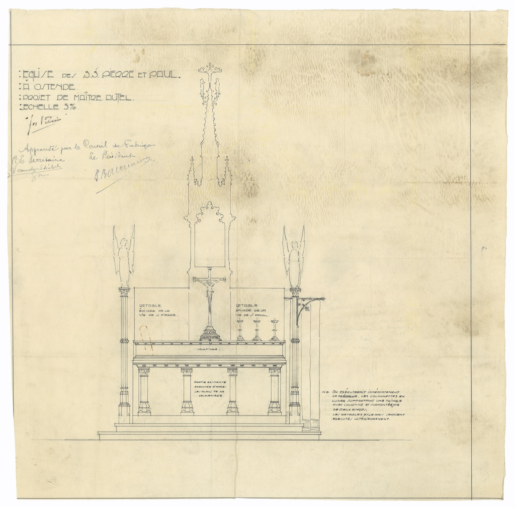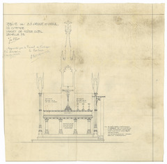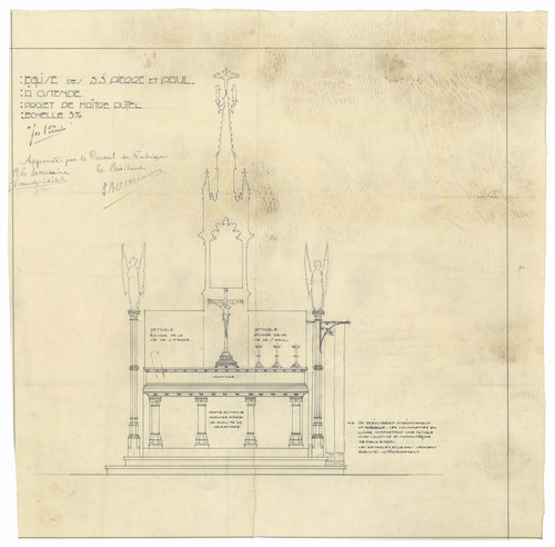 Opschrift: Eglise de S.S.Pierre et Paul à OstendeK Projet de maître autel. Omschrijving plan: ontwerp hoogaltaar, vooraanzicht Datum KCML: deze informatie wordt niet vermeld op het archiefstuk Archiefnummer: W1325
