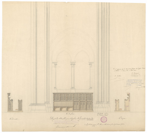 Opschrift: Projet de Stalles pour l'Eglise St. Joseph à Ostende. Omschrijving plan: ontwerp koorgestoelte Datum KCML: 9-3-1901 Archiefnummer: W1315