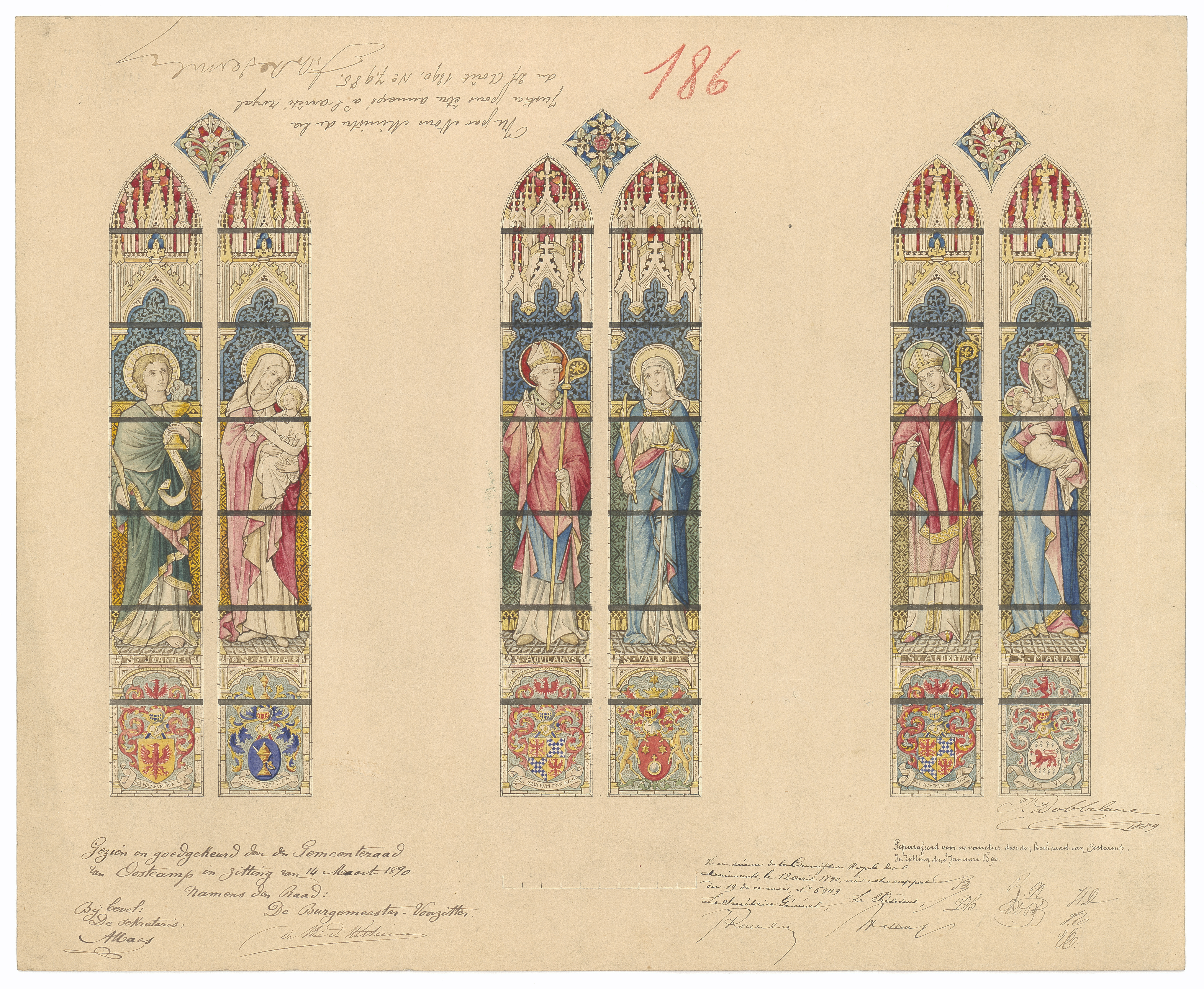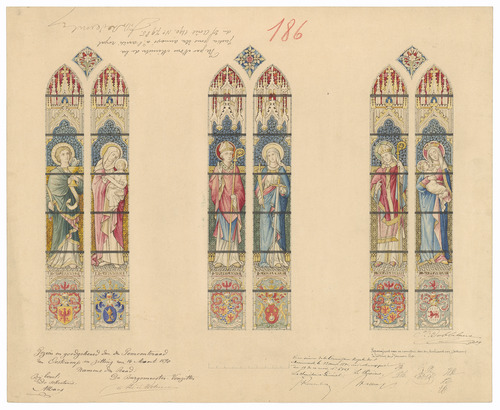 Opschrift: deze informatie wordt niet vermeld op het archiefstuk Omschrijving plan: ontwerp glasramen Datum KCML: 12/04/1890 Archiefnummer: W1365