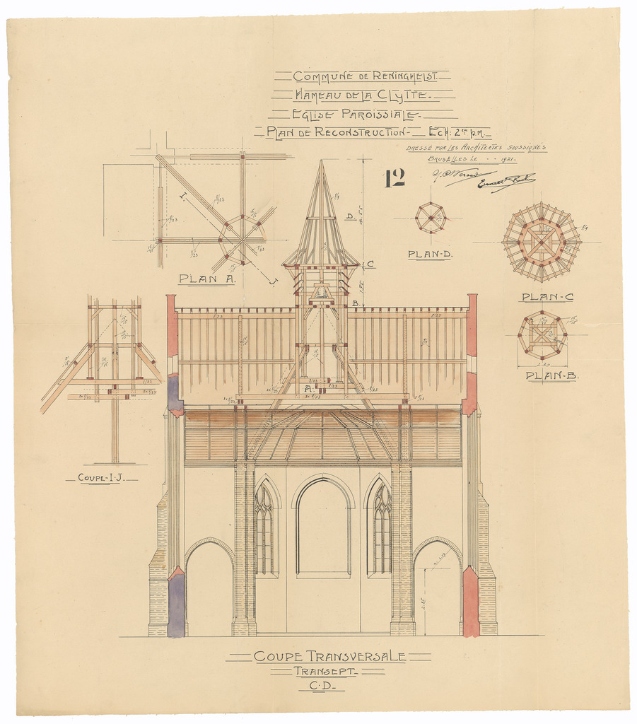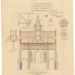 Opschrift: Commune de Reninghelst. Hameau de la Clytte. Eglise paroissiale. Plan de reconstruction Omschrijving plan: dwarsdoorsnede Datum KCML: deze informatie wordt niet vermeld op het archiefstuk Archiefnummer: W1459