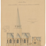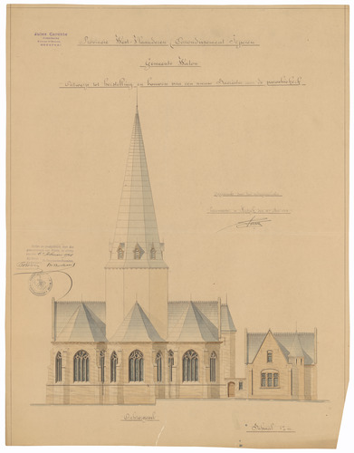Opschrift: Provincie West-Vlaanderen. Arrondissement Ieperen. Gemeente Watou. Ontwerp tot herstelling en bouwen van een nieuw Sacristie aan de parochiekerk Omschrijving plan: opstand achtergevel Datum KCML: deze informatie wordt niet vermeld op het archiefstuk Archiefnummer: W1499