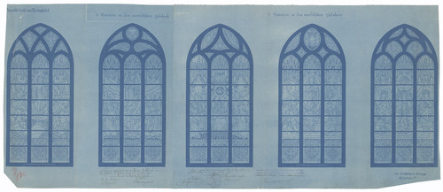 Opschrift: Parochie Kerk van Reninghelst. Vensters in den noordelijken zijdsbeuk, vensters in den noordelijken zijdskoor. Omschrijving plan: ontwerp glasramen Datum KCML: deze informatie wordt niet vermeld op het archiefstuk Archiefnummer: W1449