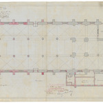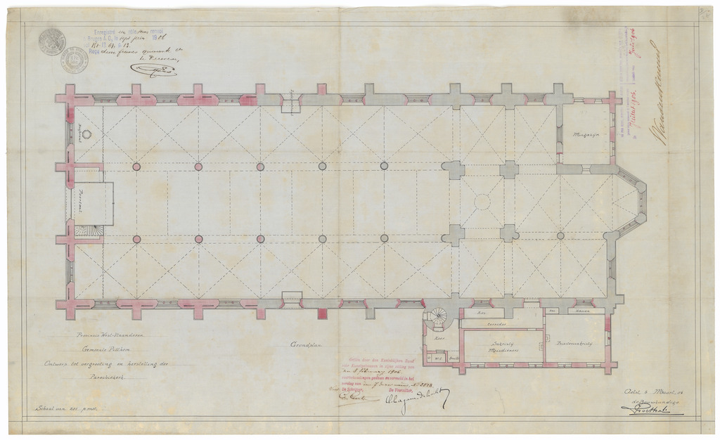 Opschrift: Provincie West-Vlaanderen. Gemeente Pitthem. Ontwerp tot vergrooting en herstelling der Parochiekerk. Omschrijving plan: plattegrond niveau 0 Datum KCML: 3-2-1906 Archiefnummer: W1402
