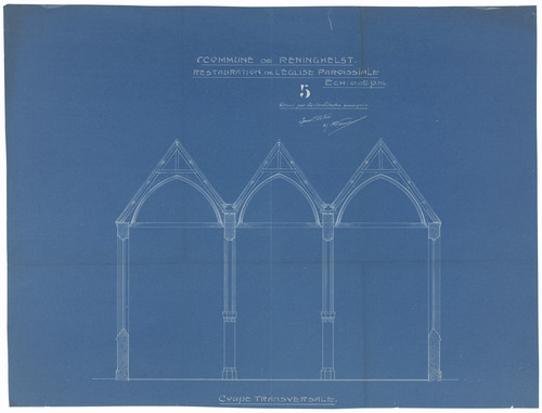 Opschrift: Commune de Reninghelst. Restauration de l'eglise paroissiale Omschrijving plan: dwarsdoorsnede Datum KCML: deze informatie wordt niet vermeld op het archiefstuk Archiefnummer: W1444