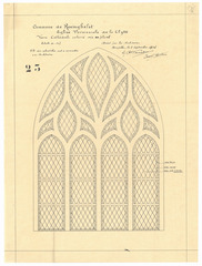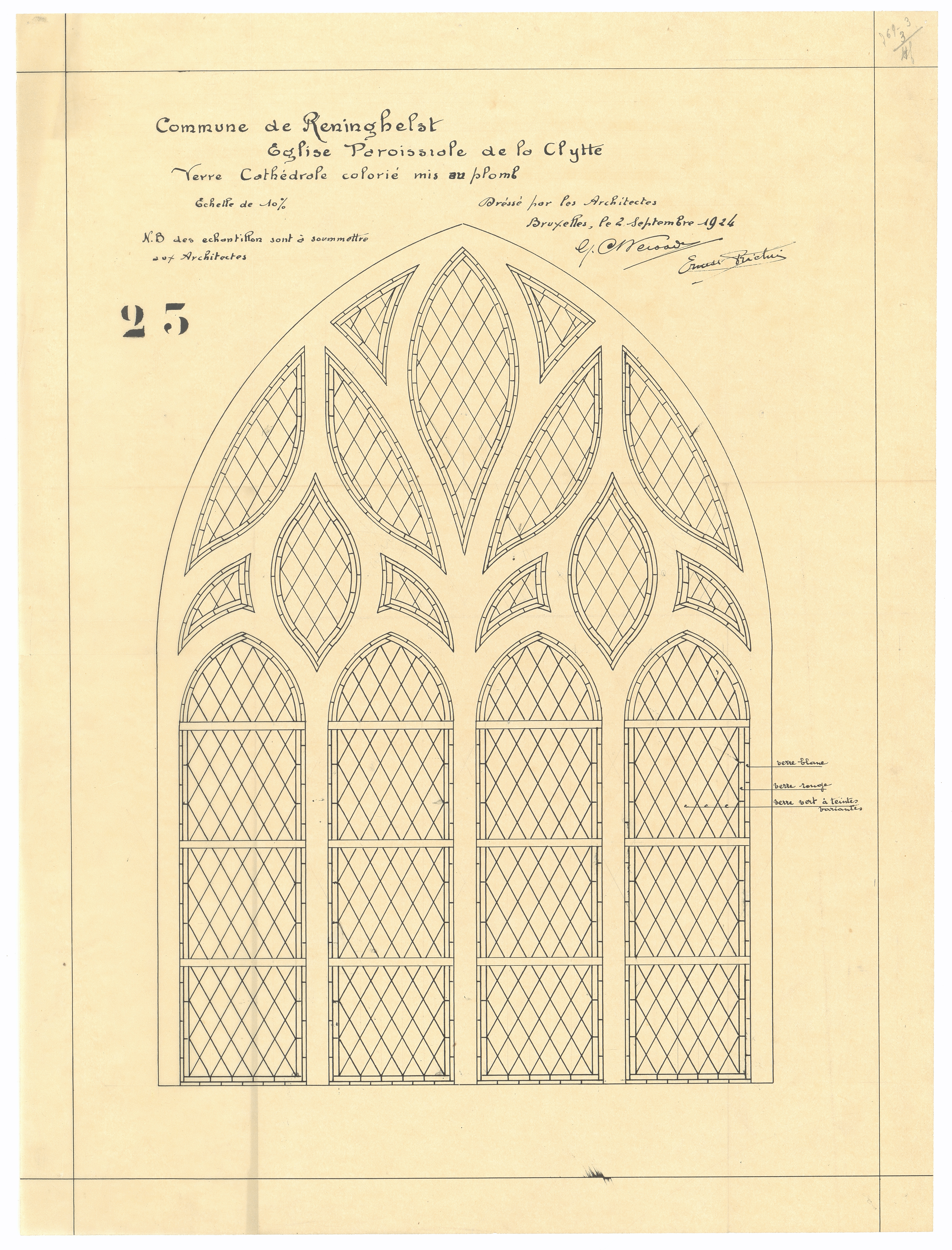 Opschrift: Commune de Reninghelst. Eglise paroissiale de la Clytte. Verre cathédrale colorié mis au plomb Omschrijving plan: ontwerp glas in lood Datum KCML: deze informatie wordt niet vermeld op het archiefstuk Archiefnummer: W1482