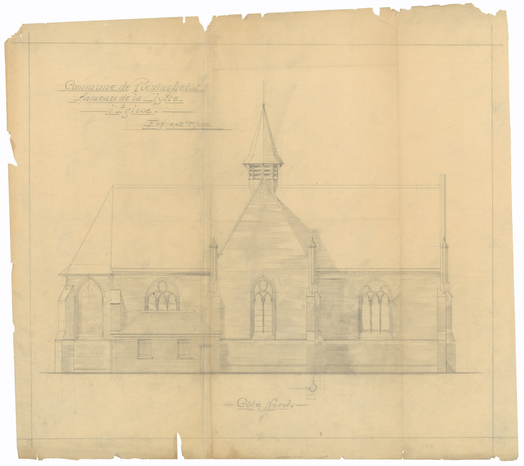 Opschrift: Commune de Reninghelst. Hameau de la Clytte. L'Eglise Omschrijving plan: opstand N-gevel Datum KCML: deze informatie wordt niet vermeld op het archiefstuk Archiefnummer: W1488