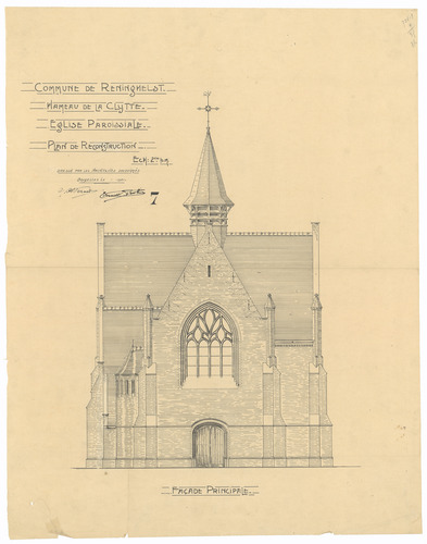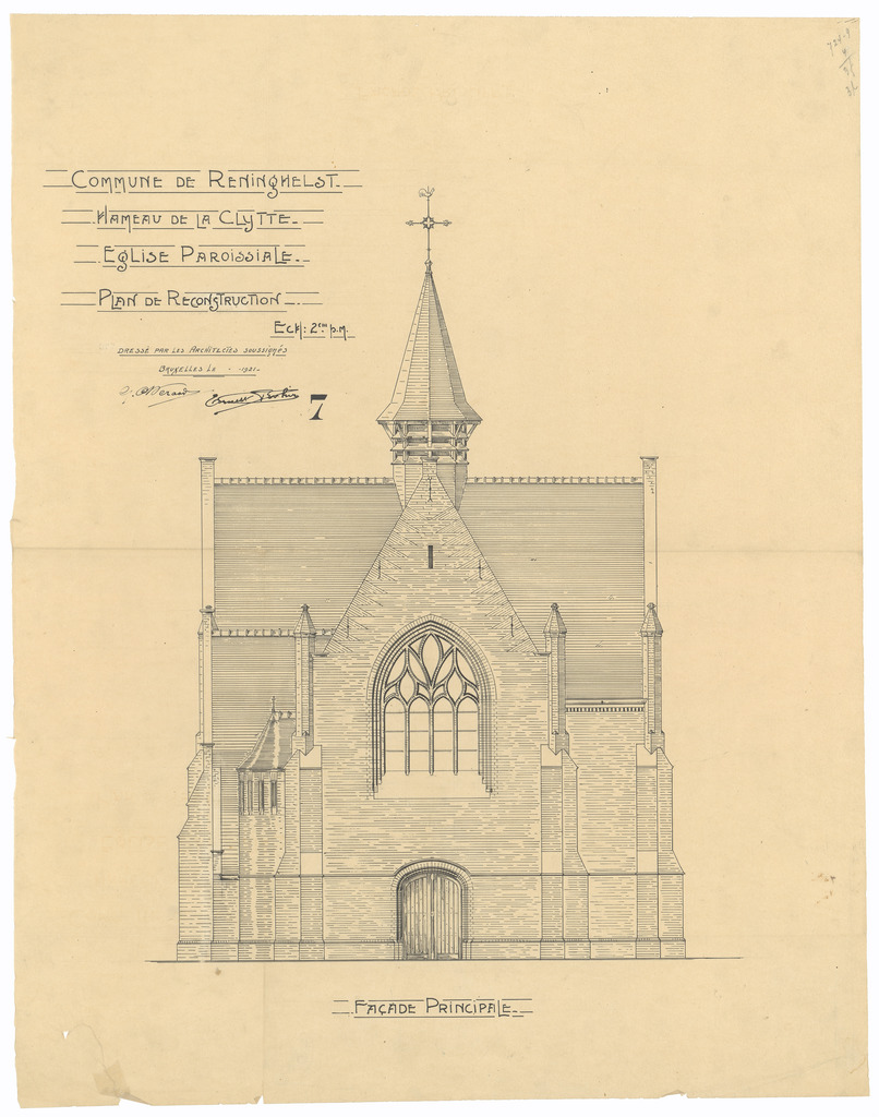 Opschrift: Commune de Reninghelst. Hameau de la Clytte. L'Eglise. Omschrijving plan: opstand voorgevel Datum KCML: deze informatie wordt niet vermeld op het archiefstuk Archiefnummer: W1468