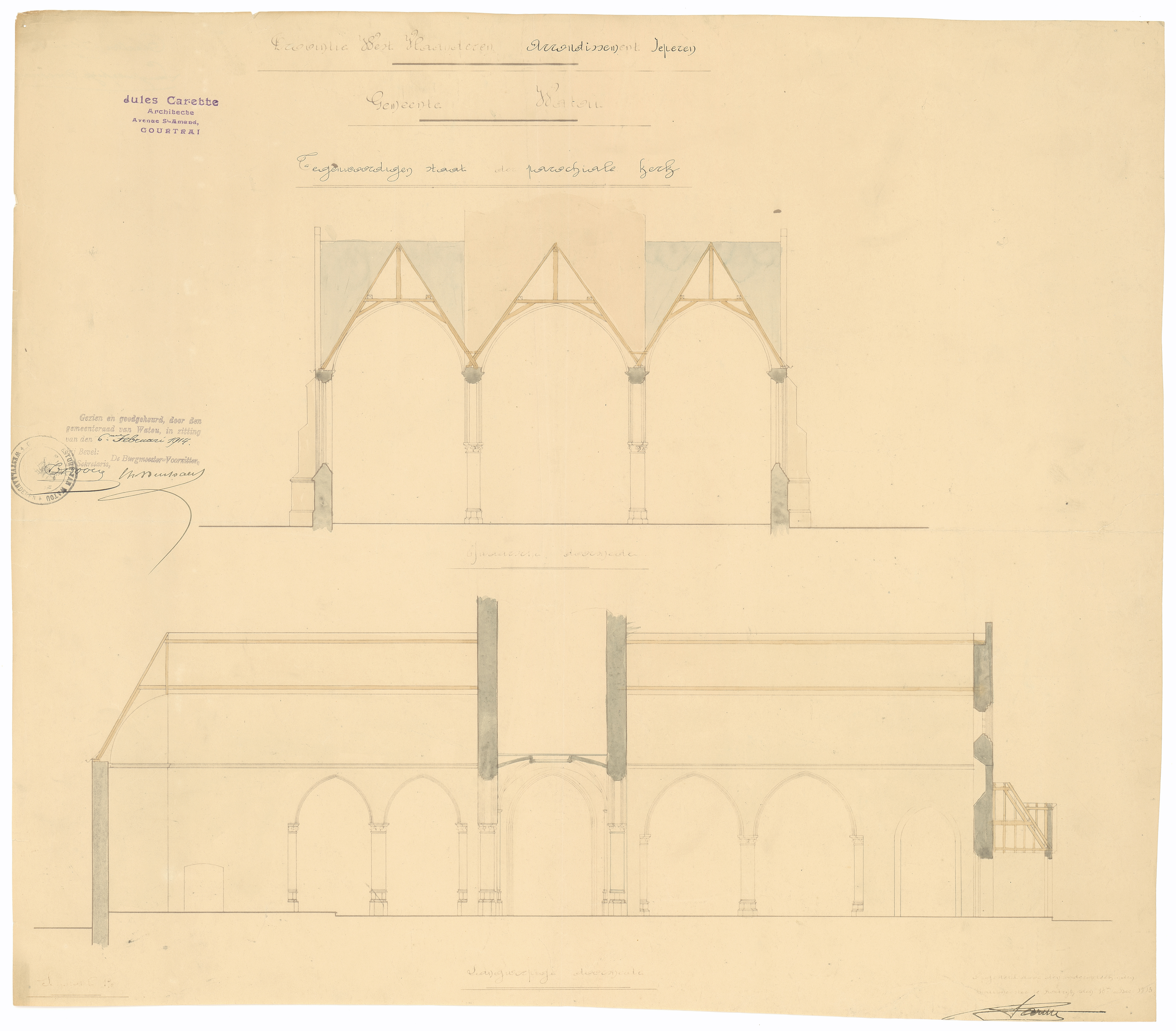 Opschrift: Provintie West-Vlaanderen. Arrondissement Ieperen. Gemeente Watou. Tegenwoordigen staat der parochiale kerk Omschrijving plan: langs- en dwarsdoorsnede Datum KCML: deze informatie wordt niet vermeld op het archiefstuk Archiefnummer: W1496