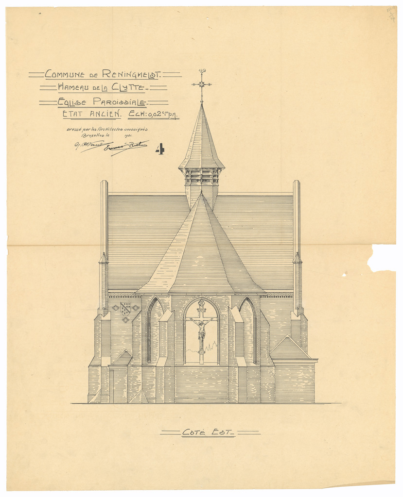 Opschrift: Commune de Reninghelst. Hameau de la Clytte. L'Eglise. Omschrijving plan: opstand achtergevel Datum KCML: deze informatie wordt niet vermeld op het archiefstuk Archiefnummer: W1465