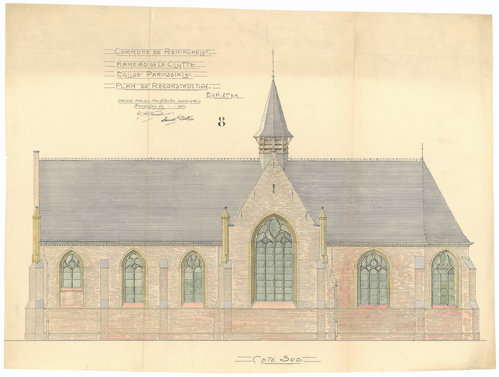Opschrift: Commune de Reninghelst. Hameau de la Clytte. Eglise paroissiale. Plan de reconstruction Omschrijving plan: opstand Z-gevel Datum KCML: deze informatie wordt niet vermeld op het archiefstuk Archiefnummer: W1453