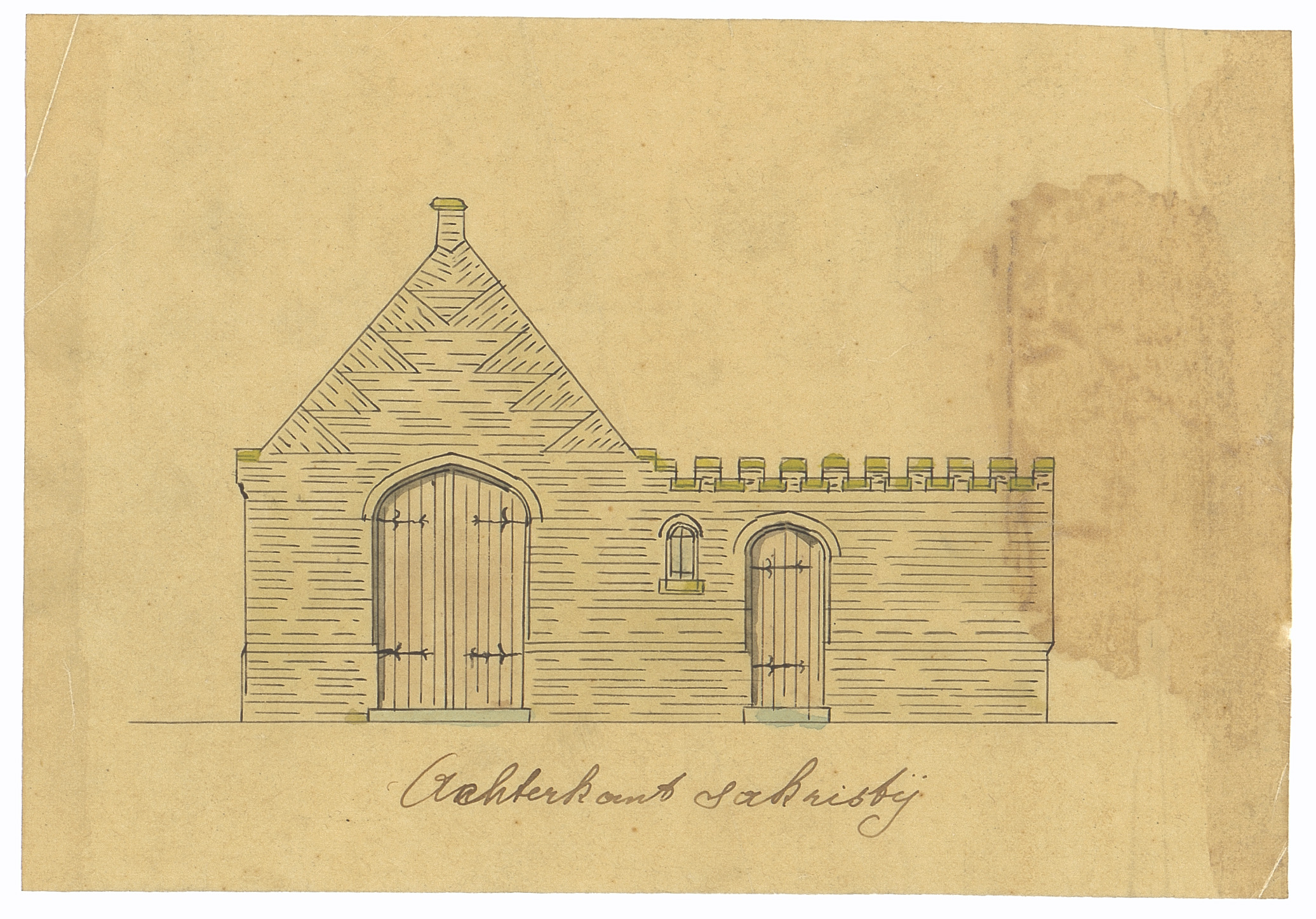 Drager: kalk op papier Techniek: pen, opgehoogd met aquarel, aanpassing op kalk Afmetingen (h x b in mm): 551 x 643 mm Schaal: 1/100