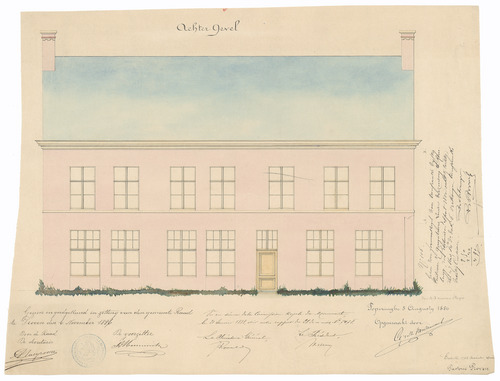 Drager: papier Techniek: pen, opgehoogd met aquarel Afmetingen (h x b in mm): 379 x 497 mm Schaal: 1/50