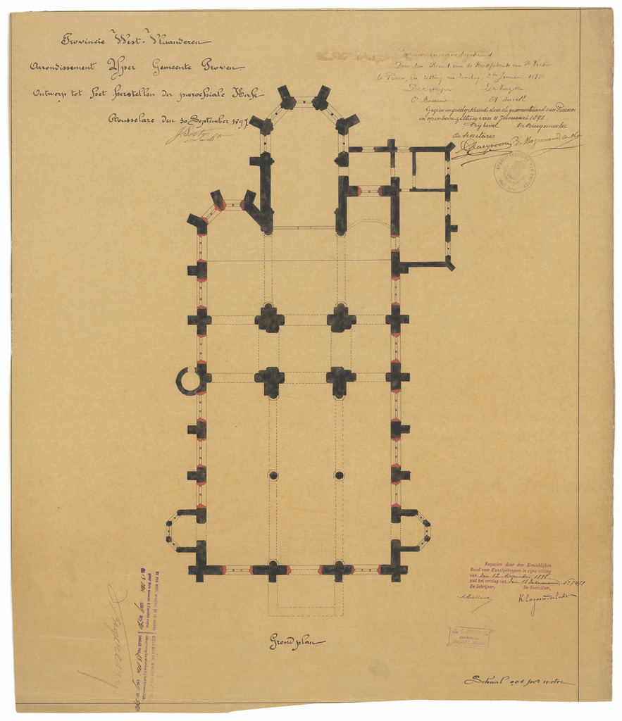 Opschrift: Provincie West-Vlaanderen. Arrondissement Yper. Gemeente Proven. Ontwerp tot het herstellen der parochiale Kerk. Omschrijving plan: plattegrond niveau 0 Datum KCML: 12/11/1898 Archiefnummer: W1429_a