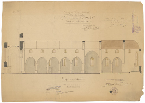Opschrift: Province de Flandre Occidentale. Ville de Roulers. Eglise paroissiale de St. Michel. Projet de restauration. Omschrijving plan: langsdoorsnede Datum KCML: 30/05/1908 Archiefnummer: W1522