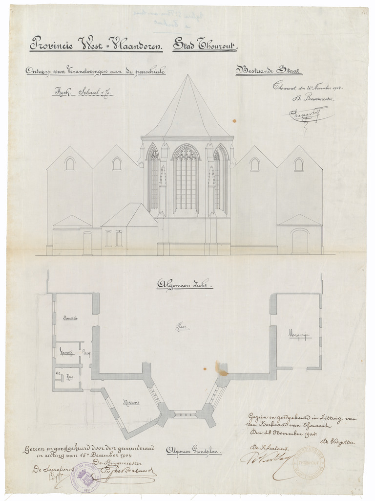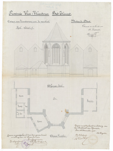 Opschrift: Provincie West-Vlaanderen. Stad Thourout. Ontwerp van veranderingen aan de parochiale Kerk. Omschrijving plan: plattegrond en opstand achtergevel Datum KCML: deze informatie wordt niet vermeld op het archiefstuk Archiefnummer: W1599