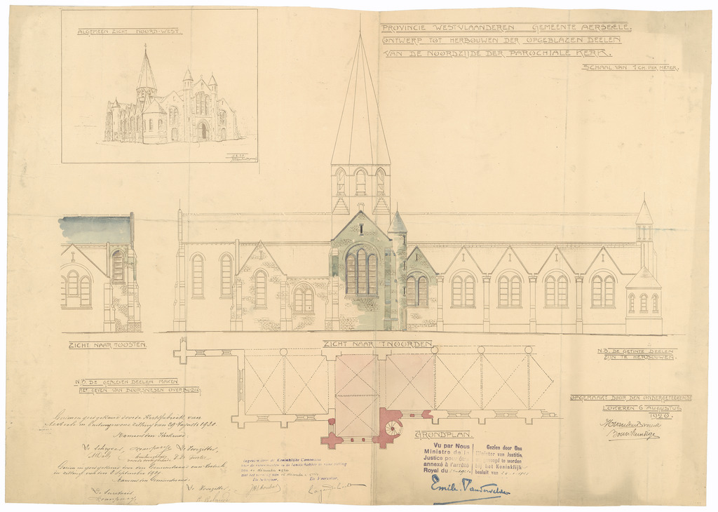 Opschrift: Provincie Westvlaanderen. Gemeente Aerseele. Ontwerp tot herbouwen der opgeblazen deelen van de noordzijde der parochiale kerk. Omschrijving plan: plattegrond, gevelopstanden en overzichtstekening Datum KCML: 11/12/1920 Archiefnummer: W1584