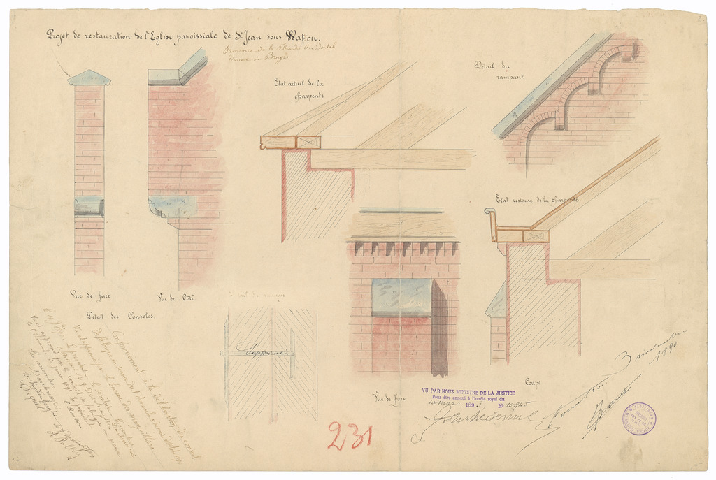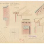 Opschrift: Projet de restauration de l'Eglise de St. Jean-Watou. Province de la Flandre Occidentale. Diocèse de Bruges Omschrijving plan: detailtekeningen gevelopstanden en doorsneden Datum KCML: deze informatie wordt niet vermeld op het archiefstuk Archiefnummer: W1505