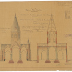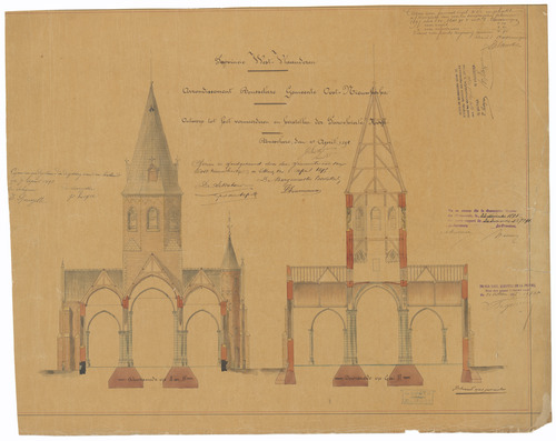 Opschrift: Provincie West-Vlaanderen. Arrondissement Ruisselede. Gemeente Oost-Nieuwkerke. Ontwerp tot het vermeerderen en herstellen der parochiale Kerk. Omschrijving plan: dwarsdoorsnede Datum KCML: 23/11/1895 Archiefnummer: W1562