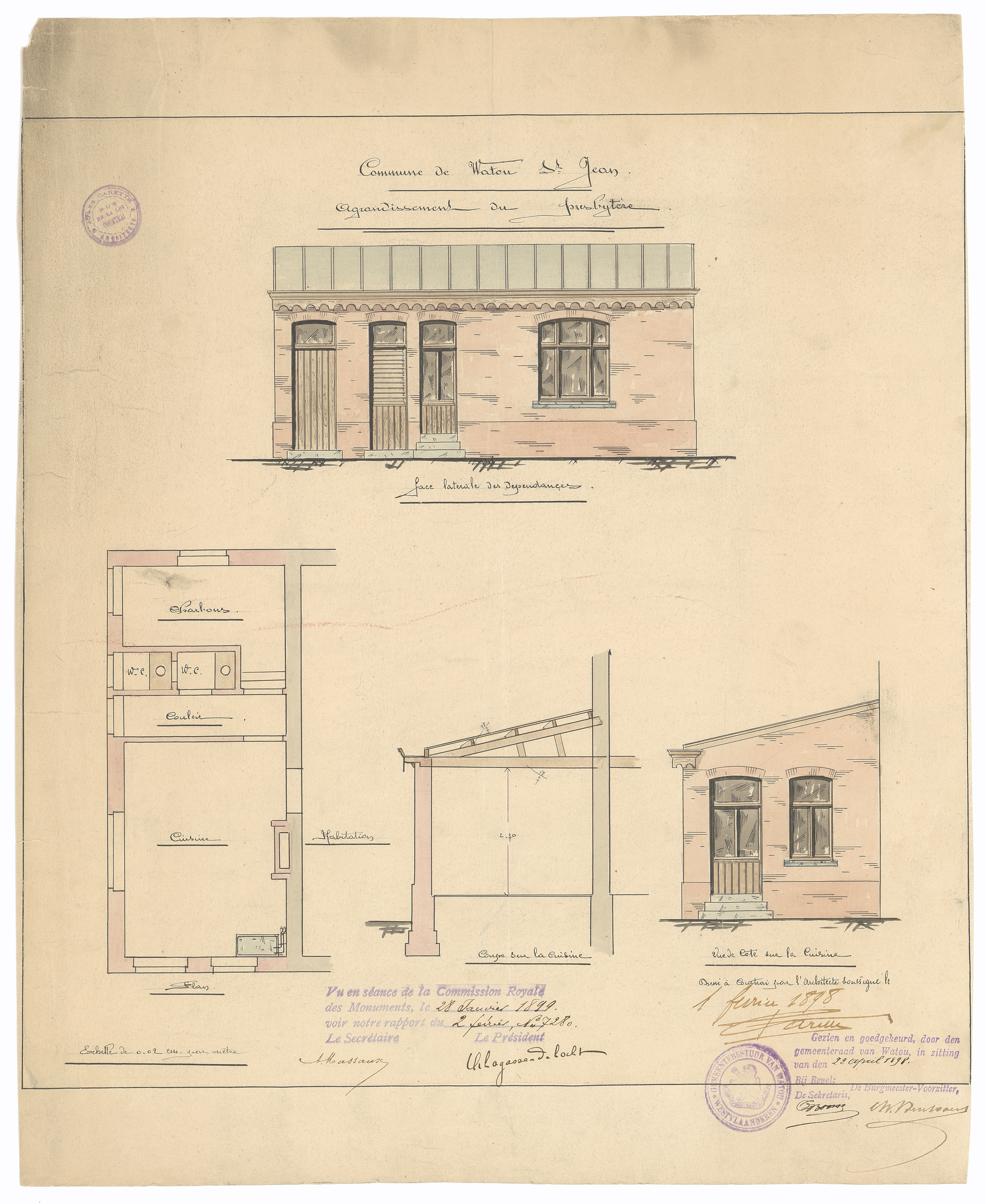 Opschrift: Commune de Watou St. Jean. Agrandissement du presbytère Omschrijving plan: plattegrond, gevelopstanden en doorsnede Datum KCML: 28/01/1899 Archiefnummer: W1508
