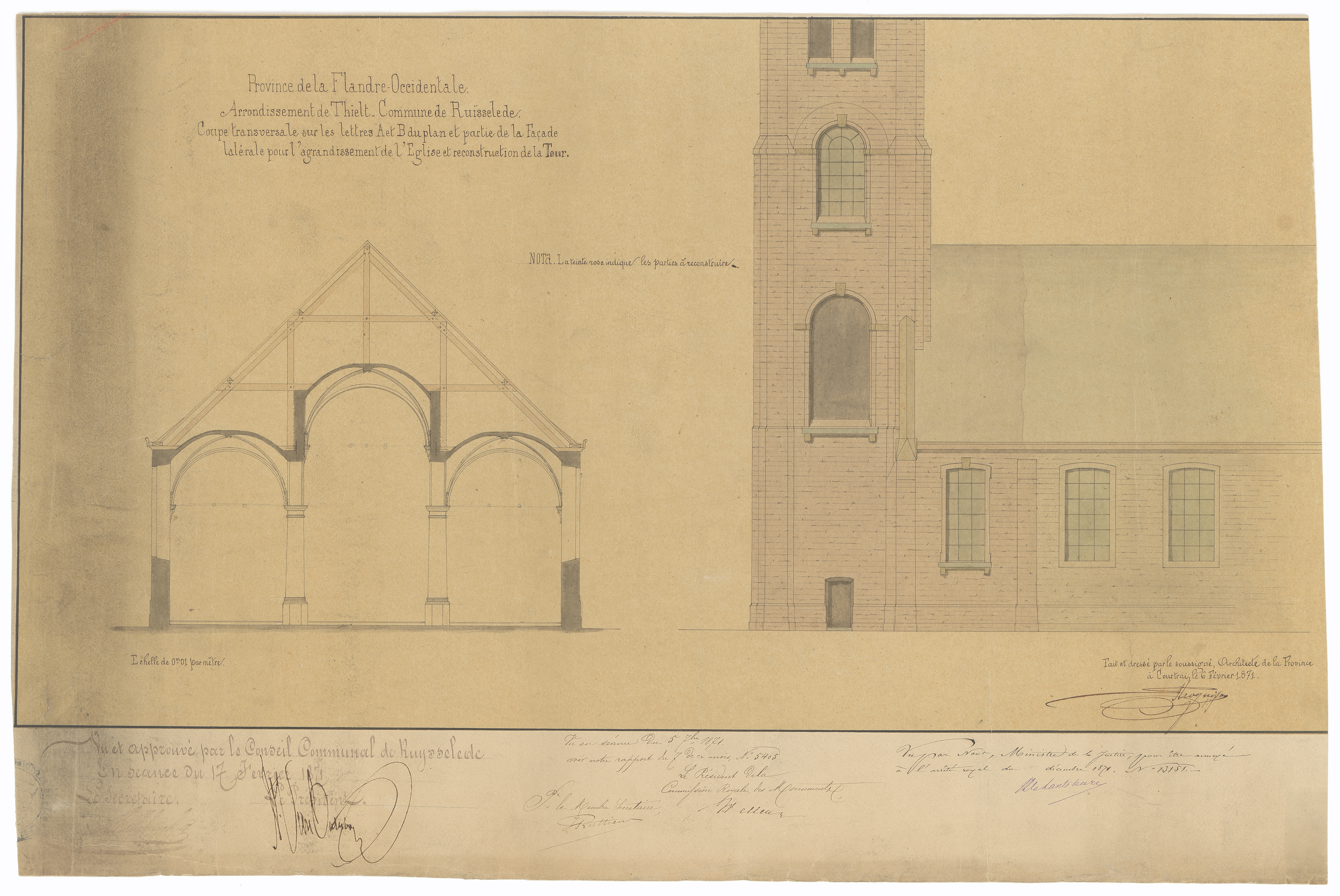 Opschrift: Province de la Flandre Occidentale. Arrondissement de Thielt. Commune de Ruisselede. Façade principale pour l'agrandissement de l'Eglise et reconstruction de la Tour. Omschrijving plan: opstand zijgevel en dwarsdoorsnede Datum KCML: 05/09/1871 Archiefnummer: W1544
