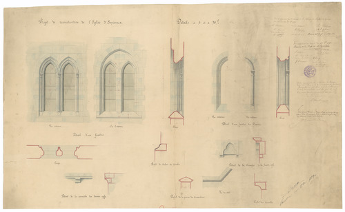 Opschrift: Projet de reconstruction de l'Eglise d'Espierres Omschrijving plan: detailtekeningen ramen Datum KCML: 13/12/1890 Archiefnummer: W1551