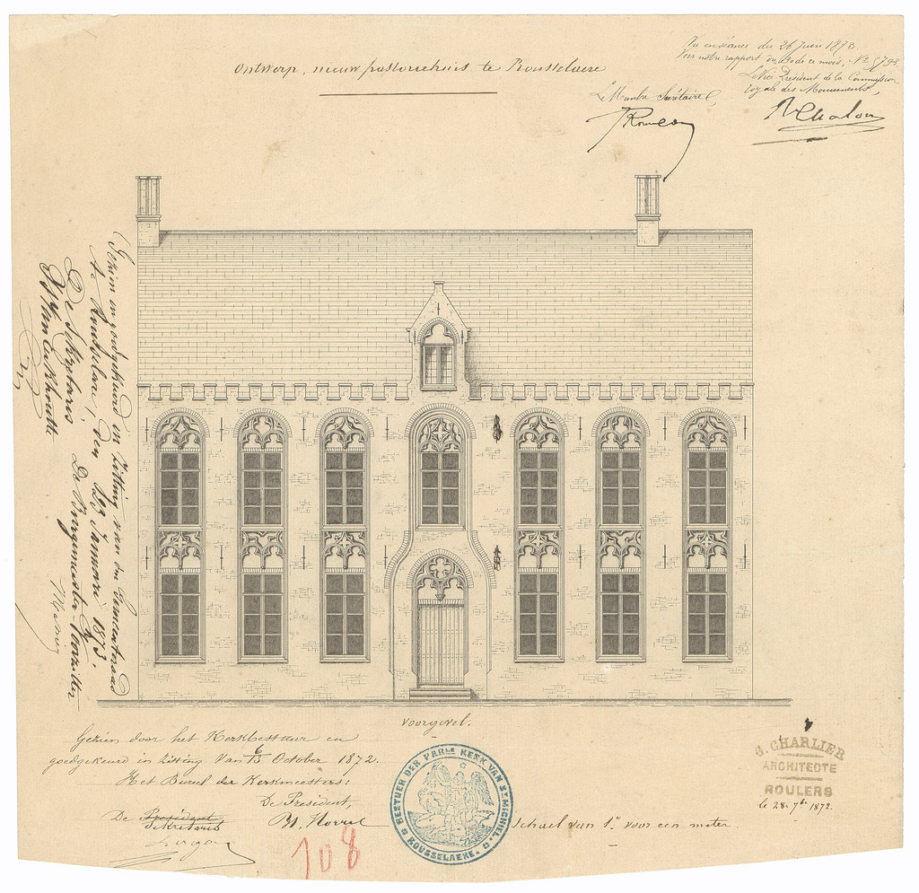 Opschrift: Ontwerp, nieuw pastoriehuis te Rousselaere Omschrijving plan: opstand voorgevel Datum KCML: 26/06/1873 Archiefnummer: W1524