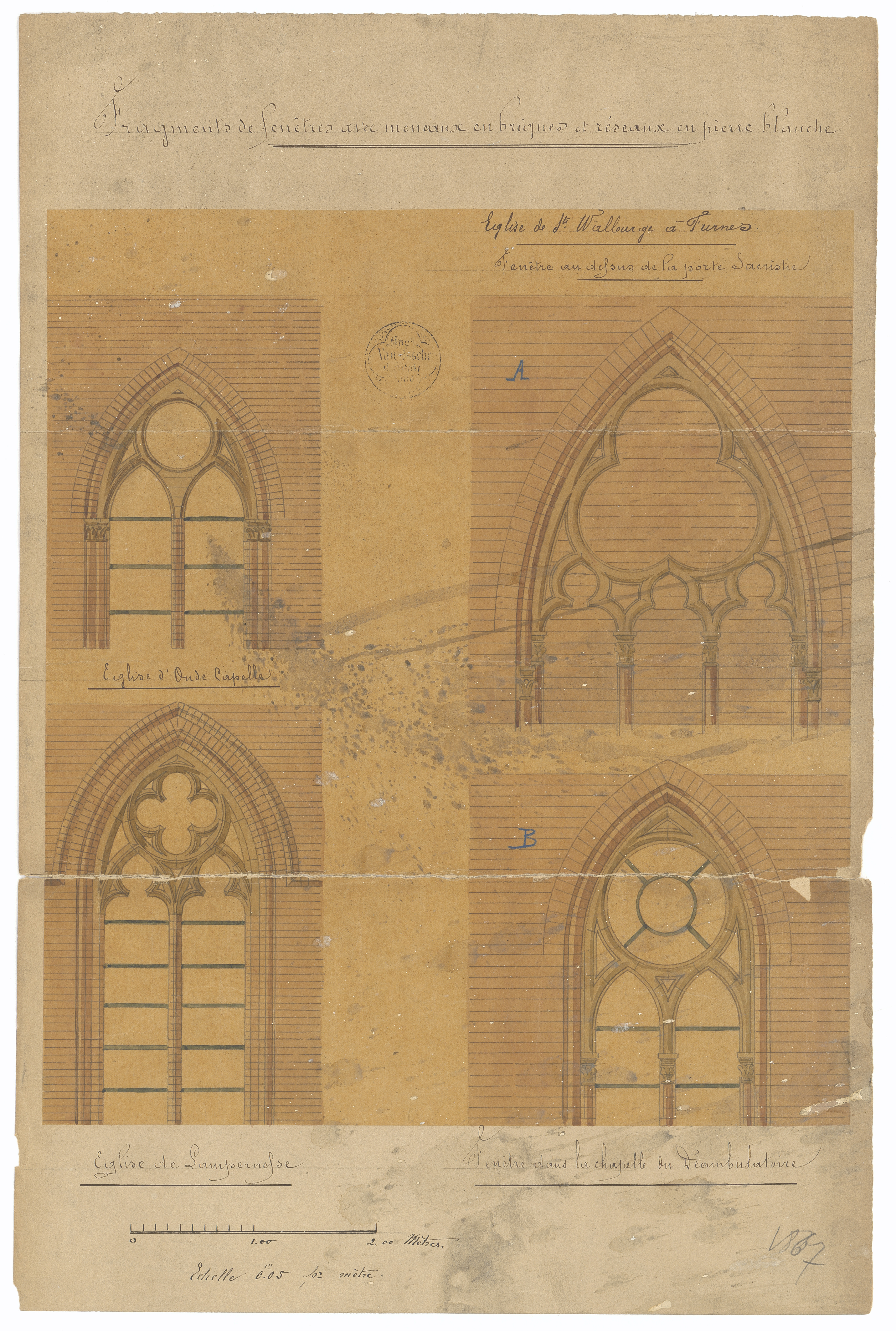 Opschrift: Fragments de fenêtres ava meneaux en briques et réseaux en pierre blanche. Omschrijving plan: ontwerp ramen Datum KCML: deze informatie wordt niet vermeld op het archiefstuk Archiefnummer: W1656