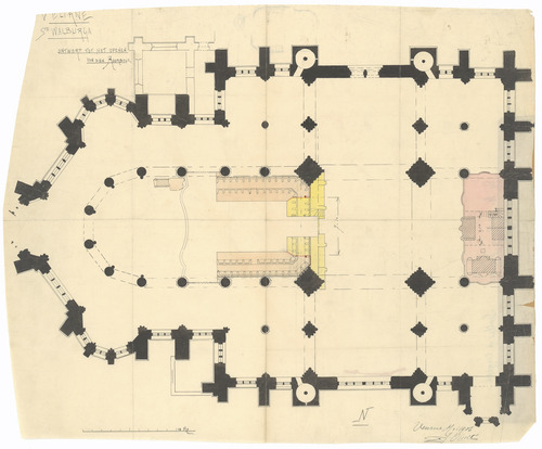 Opschrift: Veurne. Ste. Walburga. Ontwerp tot het openen van den koorbeuk. Omschrijving plan: plattegrond niveau 0 Datum KCML: deze informatie wordt niet vermeld op het archiefstuk Archiefnummer: W1660
