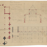 Opschrift: Provincie Westvlaanderen. Arrondissement Veurne-Dixmude. Gemeente Bulcamp. Ontwerp tot het bouwen der kerk. Omschrijving plan: plattegrond, langs- en dwarsdoorsnede Datum KCML: 01/03/1884 Archiefnummer: W1684