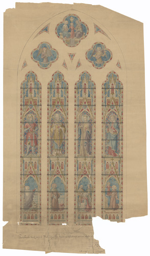 Opschrift: Parochiale kerk van St Walburge te Veurne. Ontworp voor eene venster in.. Omschrijving plan: ontwerp glasraam Datum KCML: deze informatie wordt niet vermeld op het archiefstuk Archiefnummer: W1671