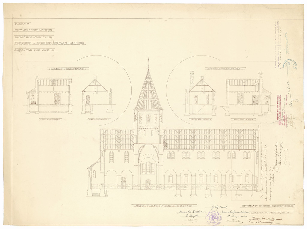 Opschrift: Provincie Westvlaanderen. Gemeente St.Baefs-Vijfve. Vergrooting en herstelling der parochiale kerk. Omschrijving plan: langsdoorsnede Datum KCML: 28/01/1911 Archiefnummer: W1782