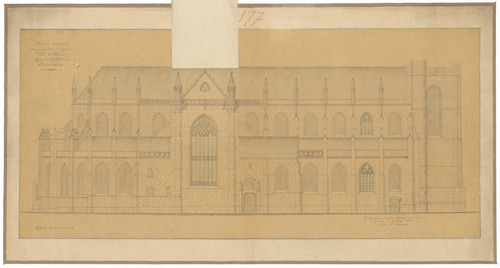 Opschrift: Flandre Occidentale. Arrondissement d'Ypren. Ville de Wervick. Eglise St. Médard. Restauration Omschrijving plan: opstand zijgevel 1 Datum KCML: 30/01/1886 Archiefnummer: W1728_02