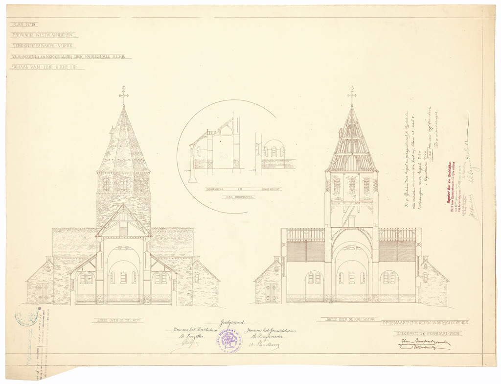 Opschrift: Provincie Westvlaanderen. Gemeente St.Baefs-Vijfve. Vergrooting en herstelling der parochiale kerk. Omschrijving plan: dwarsdoorsnede Datum KCML: 28/01/1911 Archiefnummer: W1783
