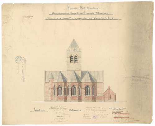 Opschrift: Provincie West-Vlaanderen. Arrondissement Kortrijk - Gemeente Moorseele. Ontwerp tot herstellen en vergrooten der Parochiale Kerk. Omschrijving plan: opstand achtergevel Datum KCML: 26/06/1909 Archiefnummer: W1764
