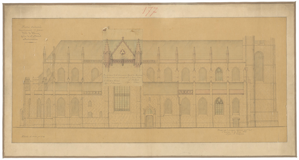 Opschrift: Flandre Occidentale. Arrondissement d'Ypren. Ville de Wervick. Eglise St. Médard. Restauration Omschrijving plan: opstand zijgevel 1 (aangepast ontwerp) Datum KCML: 30/01/1886 Archiefnummer: W1728_01