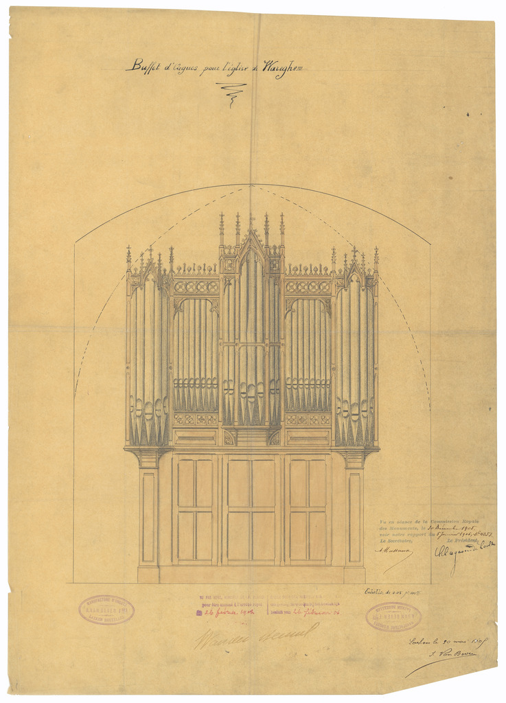 Opschrift: Buffet d'Orgues pour l'Eglise de Wareghem. Omschrijving plan: ontwerp orgelkast Datum KCML: 30/12/1905 Archiefnummer: W1718