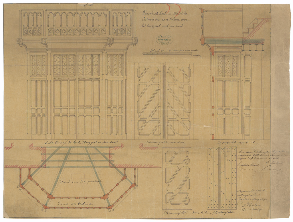 Opschrift: Parochiale kerk te Wielsbeke. Ontwerp van eene tribune voor het hoogzaal met poortaal Omschrijving plan: ontwerp hoogzaal Datum KCML: 22/11/1890 Archiefnummer: W1771