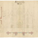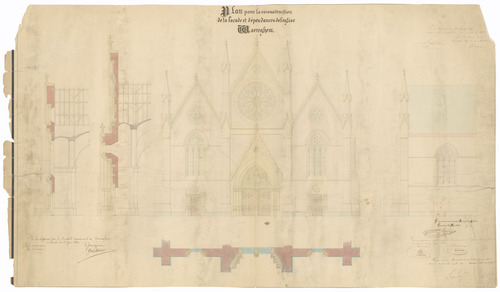 Opschrift: Plan pour le reconstruction de la façade et dépendances de l'église. Waereghem. Omschrijving plan: gevelopstanden en doorsnede Datum KCML: 16/08/1865 Archiefnummer: W1712