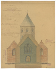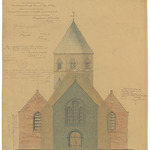 Opschrift: Provincie West-Vlaanderen. Arrondissement Kortrijk - Gemeente Vijve St. Eloy. Ontwerp tot het vermeederen en herstellen der parochiale kerk. Omschrijving plan: opstand voorgevel (aangepast ontwerp) Datum KCML: 06/05/1899 Archiefnummer: W1721_01
