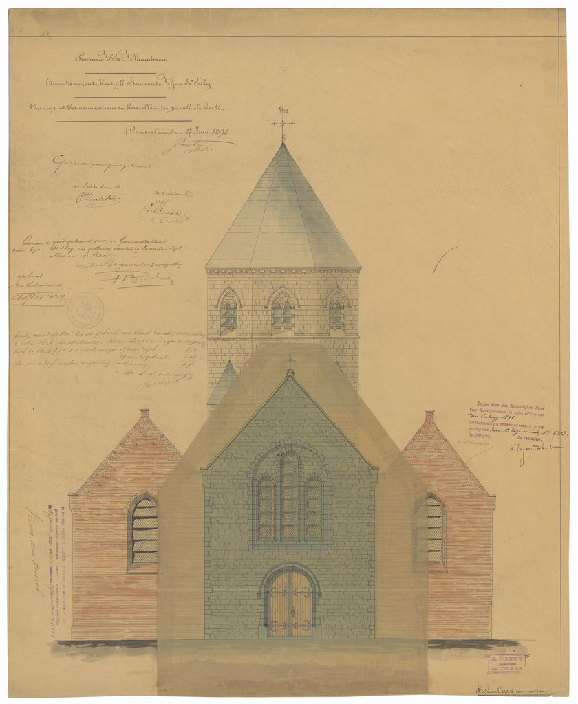 Opschrift: Provincie West-Vlaanderen. Arrondissement Kortrijk - Gemeente Vijve St. Eloy. Ontwerp tot het vermeederen en herstellen der parochiale kerk. Omschrijving plan: opstand voorgevel (aangepast ontwerp) Datum KCML: 06/05/1899 Archiefnummer: W1721_01